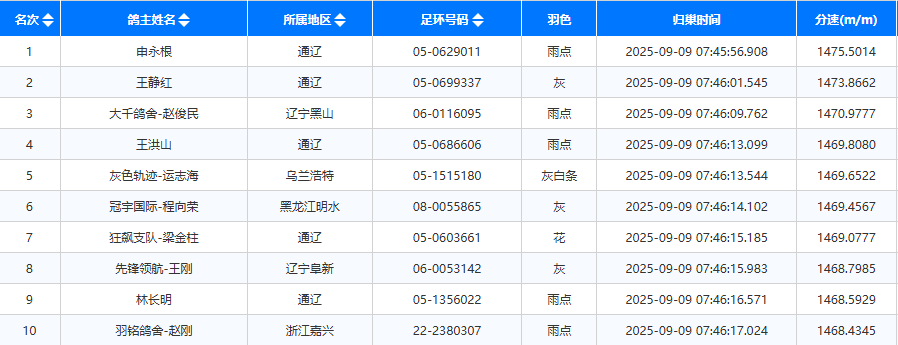 早上6点37分,内蒙古通辽兄弟公棚打响103公里收费站,司放地为科右中旗好腰苏木。本场上笼13780羽。经过激烈角逐,7点45分,冠军诞生!来自申永根的05-0629011雨点率先归巢,赢下本场冠军,平均分速1475.5014米/分。王静红的05-0699337灰鸽随后拿下亚军,平均分速1473.8662米/分。季军由大千鸽舍-赵俊民的06-0116095雨点获得,平均分速1470.9777米/分。