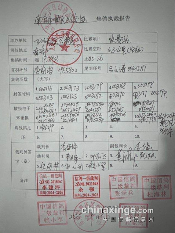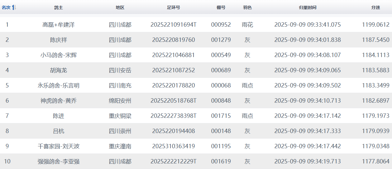 8点58分,四川南充豪杰赛鸽公棚43公里收费站开赛,司放地南部,集鸽7848羽。9点33分左右,首批归巢鸽报进。来自高磊+牟建洋的2025221091694T雨花拔得头筹,平均分速1199.0612米/分。陈庆祥的2025220819760灰鸽摘下亚军,平均分速1187.5450米/分。季军由小马鸽舍-宋辉的2025221046881灰鸽取得,平均分速1184.1113米/分。