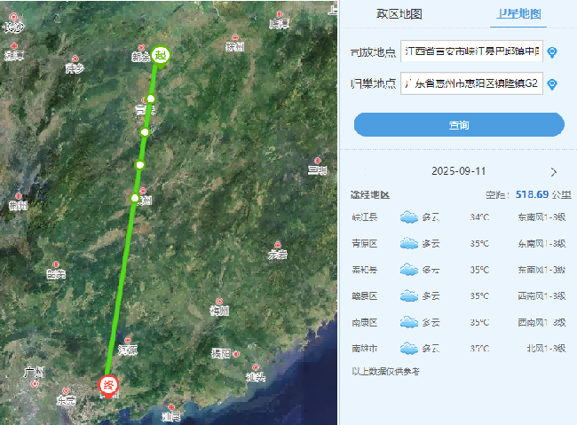 可惜的是天公也不作美,司放地天气灰蒙阴沉,不见阳光。沿途天气以多云为主,局部有雨,给赛鸽定向增加难度;近三分之二的赛程风向为侧逆风,过南雄市之后转为北风顺风,风力1-3级。最高气温更是达到35℃,闷热的天气进一步消耗着赛鸽的体力。