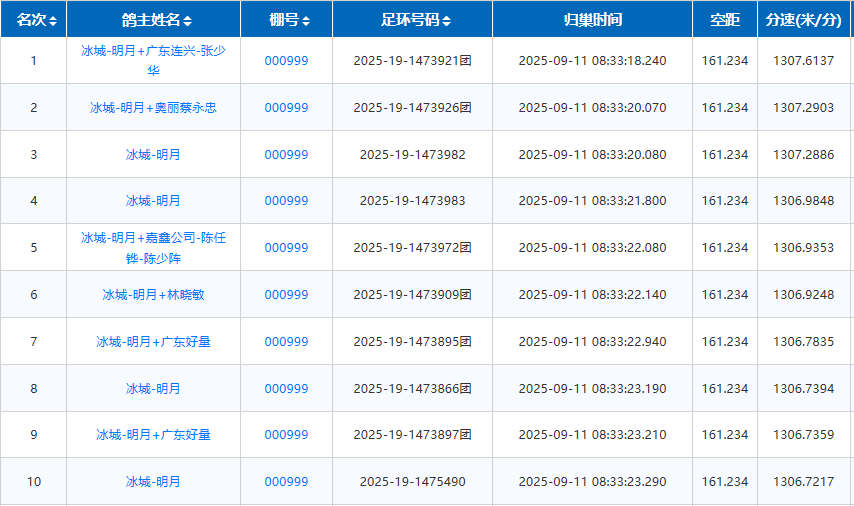 冠军冰城-明月+广东连兴-张少华,赛鸽环号2025-19-1473921团,08:33:18打钟,飞行分速1307.6137米/分。