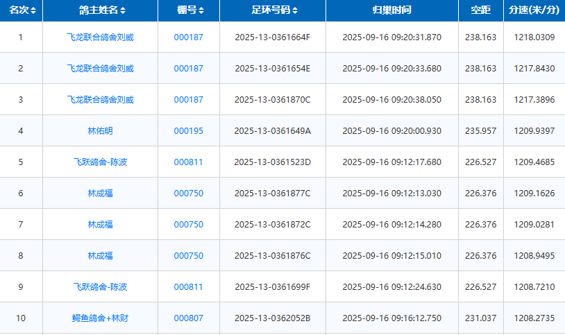 经过三个多小时的激烈角逐,首批归巢鸽陆续报到。飞龙联合鸽舍刘威表现抢眼,麾下三羽赛鸽强势包揽冠、亚、季军。其中,冠军鸽环号2025-13-0361664F,飞行空距238.163公里,以平均分速1218.0309米/分的优异成绩率先归巢,尽显强劲实力。亚军环号2025-13-0361654E,季军环号2025-13-0361870C。本场比赛,三羽强将也为鸽主赢得了满堂喝彩。