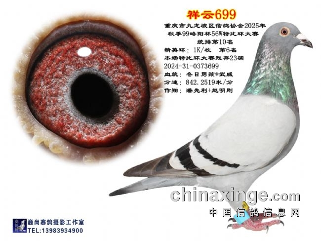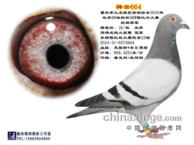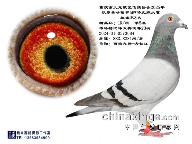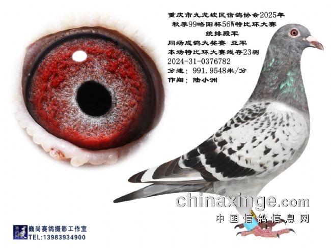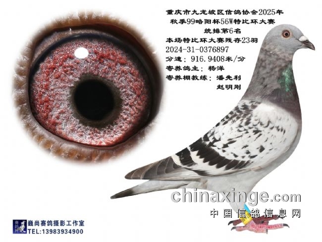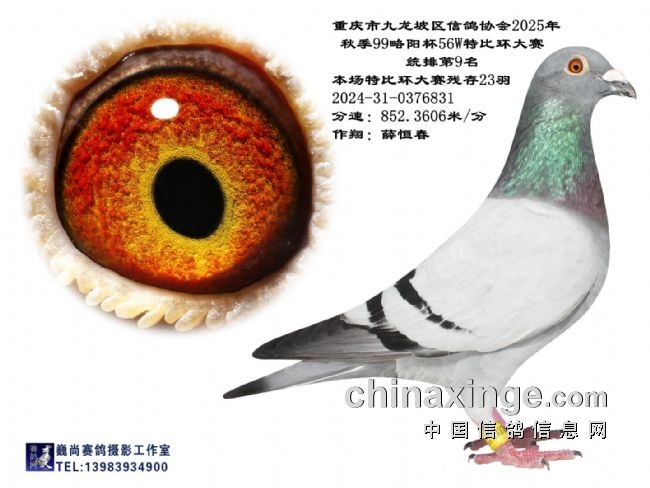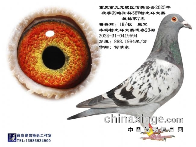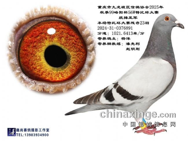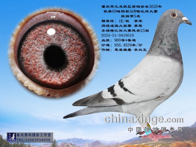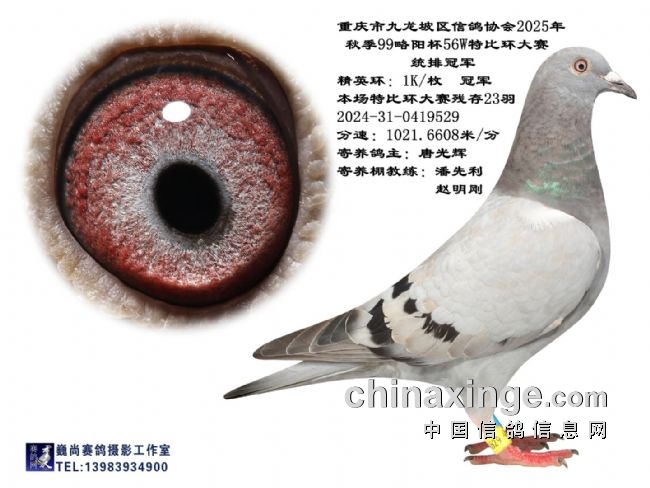 赛事落幕,荣耀加冕。一羽英姿勃发的灰鸽傲视群雄,足环号2024-31-0419529,以1021.6608米/分的综合分速问鼎巅峰,拿下综合冠军,此羽战将由鸽友唐光辉寄养。