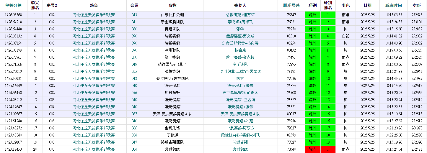 上午10时15分03秒,山东长胜公棚团队的一羽76347打钟报进,寄养人总裁鸽苑+谢万红,分速1426.9356米/分,空距252公里,羽色雨点,获得本场比赛冠军。