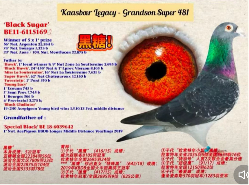 “黑鹰”本身荣获威尔森联省8105羽冠军,作出子代“特别黑鹰”荣膺2019年KBDB全国中长距离一岁鸽王冠军,令盖伊.范德奥维拉的名字再度响彻鸽坛。
