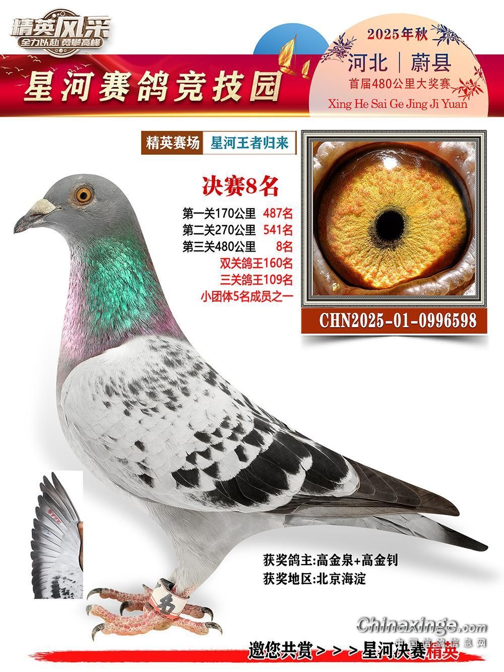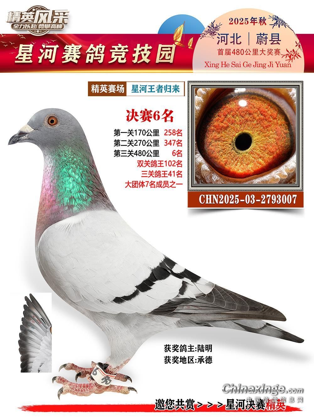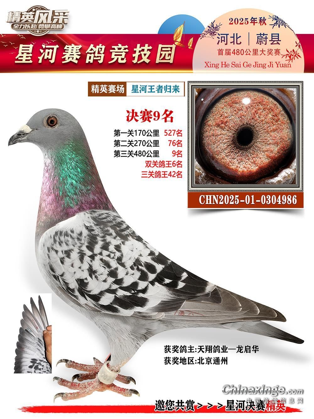最后,来自北京顺义区的鸽友李茂海斩获首届大奖赛的决赛冠军。冠军鸽是一羽红轮,环号2025-01-1437614T,分速952.507米/分,属于后来居上的爆发型选手。此鸽在一关仅排1139名、二关462名,到了决赛才崭露头角,一举夺魁。接下来一起欣赏决赛前十风采: