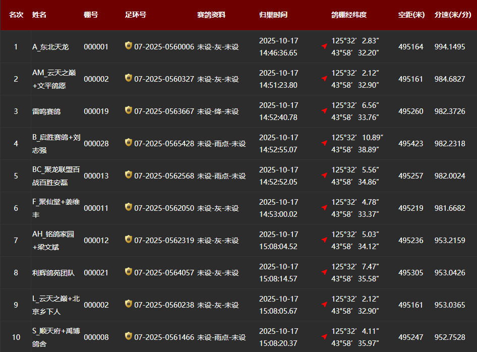 下午14时46分36秒,001号棚东北天龙一羽灰鸽打钟报进。赛鸽环号2025-07-0560006,分速994.1495米/分,空距495.164公里,这羽小将领先亚军鸽5分钟报进,斩获决赛冠军!目前四关综合暂排24名。