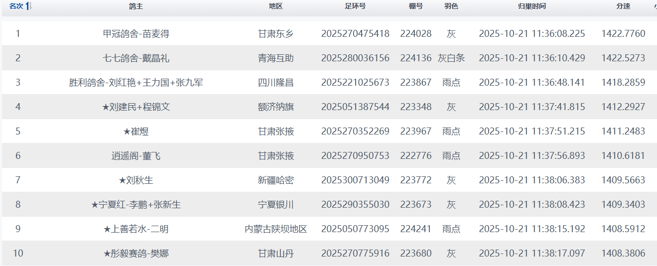 中午11点36分,首批归巢小队报进。来自甲冠鸽舍-苗麦得鸽友名下2025270475418灰鸽报进,以1422.7760米/分的速度拔得头筹。接着,七七鸽舍-戴晶礼的2025280036156灰白条拿下亚军,平均分速1422.5273米/分。胜利鸽舍-刘红艳+王力国+张九军的2025221025673雨点获得季军,平均分速1418.2859米/分。