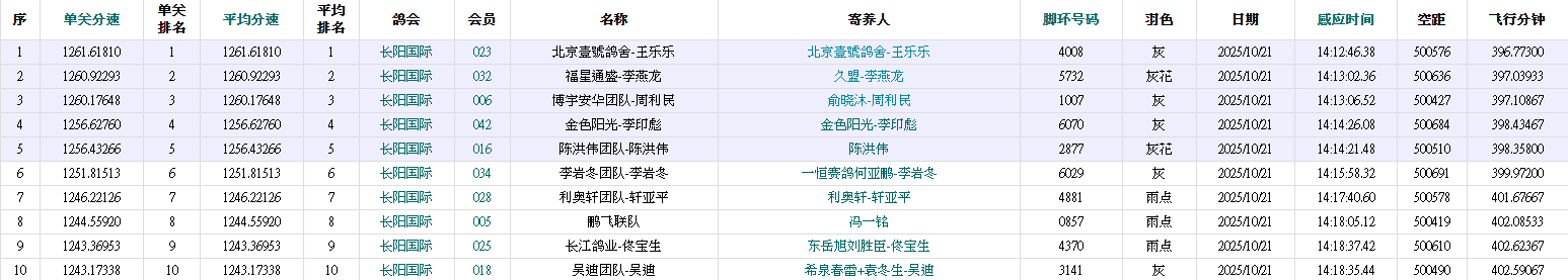 随后,久盟-李燕龙的5732号灰花鸽以1260.9229米/分的速度位列亚军;俞晓沐-周利民的1007灰鸽以1260.1764米/分的速度斩获季军。