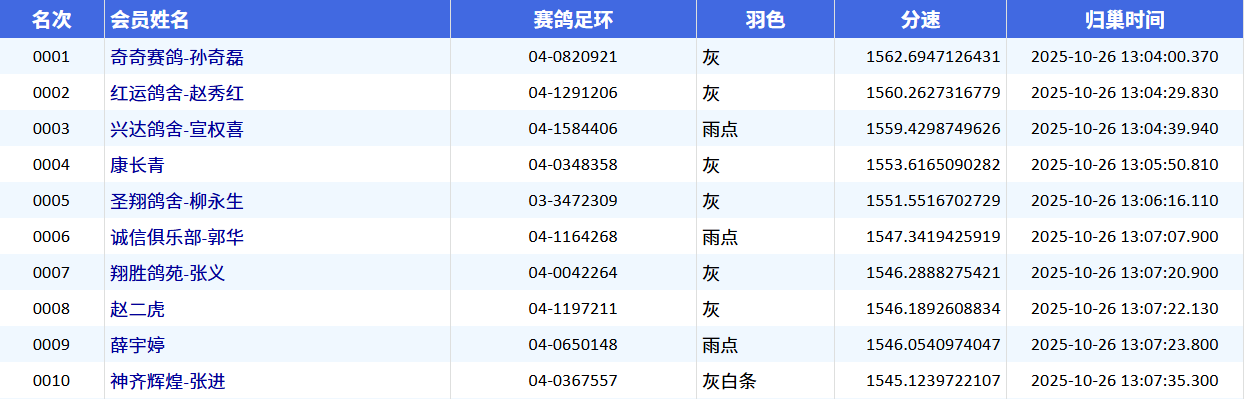 下午13时04分整,奇奇赛鸽-孙奇磊的一羽灰鸽打钟报进,环号04-0820921,分速1562.6947米/分,斩获决赛冠军。