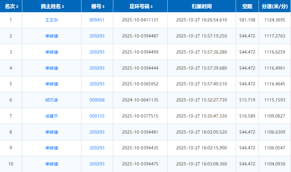 下午15时57分,来自通州区的鸽友季婷健一连报进四羽,暂排南通市中距离信鸽联赛总亚军、总季军、总殿军、第五名。亚军鸽环号2025-10-0394487,空距544.472,分速1117.2763米/分。季军鸽环号2025-10-0394499,分速1116.6259米/分。殿军鸽与第五名的分速分别为1116.4961米/分、1116.4645米/分。