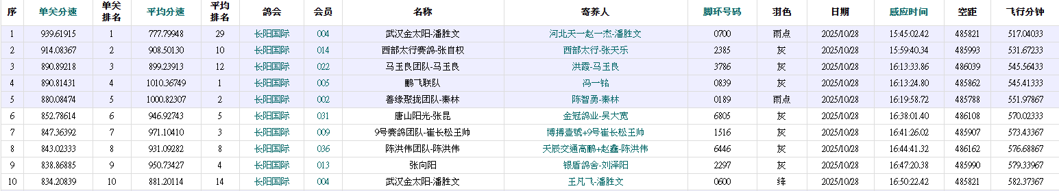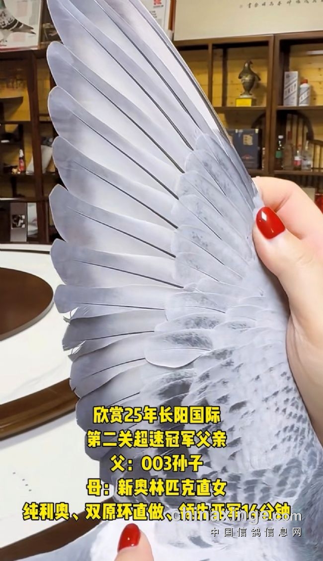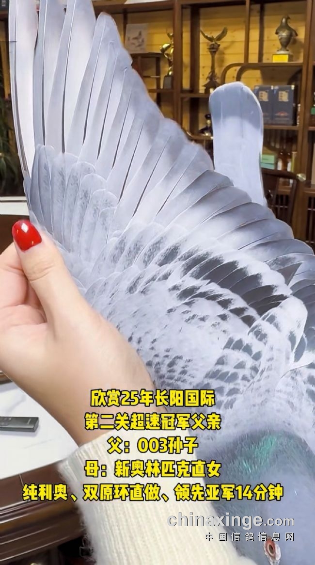 当天下午15点45分2秒,冠军顺利归巢,来自寄养人河北天一鸽舍的赵一杰-潘胜文。这羽0700雨点鸽飞行空距为485.821公里,分速为939.6191米/分,领先第二名足足14分钟。据了解,这羽冠军鸽是晚生雌,血统显赫,出自“利奥003孙代”与“新奥林匹克直女”的配对组合。其父为纯血利奥,其母曾获四关鸽王第76名,冠军双亲均为原环鸽,采用“小雄配大雌”的经典配对方式。
