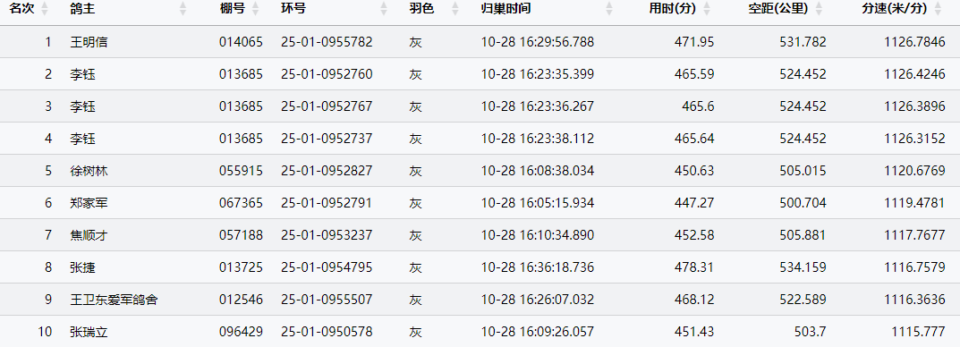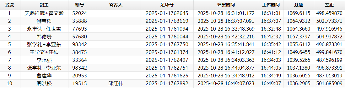 16时31分,鸽友天赐祥冠+霍文毅的2025-01-1762645报进,分速1069.6115米/分,空距498.459公里,斩获本关冠军。