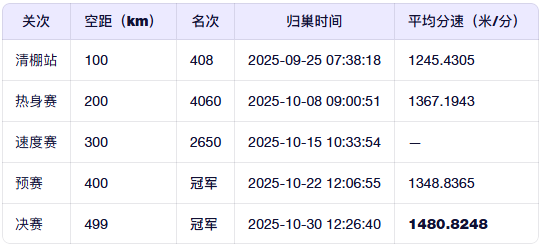 恭喜鸽主全一鸽舍-仪修权,能够在决赛中揽获冠军,确实值得庆贺。但这并非9908首次获得冠军。此前400公里预赛中,它就已经拿下冠军,再加上决赛的冠军,双冠闪耀,成功加冕本届双关鸽王总冠军,堪称一羽“神奇小鸟”!以下是这羽0479908前几关的详细表现: