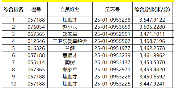 三关综合鸽王冠军是名家焦顺才的25-01-0953238,综合分速3457.9122米/分,三关成绩分别为一关6名、二关75名、三关13名。