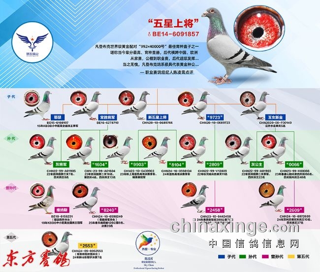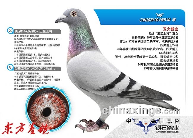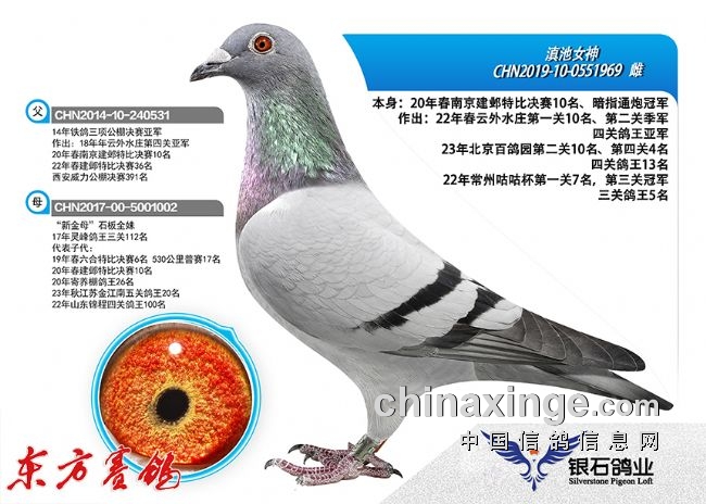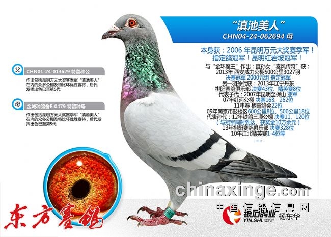 主血传奇:“滇池美人”为银石创造太多传奇,继续奉行“天下武功唯快不破”的竞技理念,引进了范登布克世界级配对“992x4000号”最佳代表直子-“五星上将”使得银石鸽业的家系又得到了质的飞跃!其在比利时直接作出直女“耶瑟/伊莎”荣获2015年KBDB全国鸽王9名,外曾孙女“维纳斯”更是青出于蓝而胜于蓝获得了2018年KBDB鸽王冠军,落户中国后,其家族又获得了22--23年在百鸽园获得前十以内高奖、2023年又获上海蓝色海湾公棚决赛季军、精英赛冠军,2024年西安慧能春棚第一关7名、决赛62名,三关鸽王13名等众多佳绩!