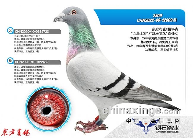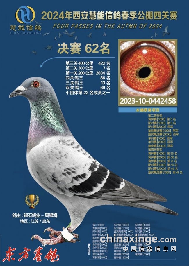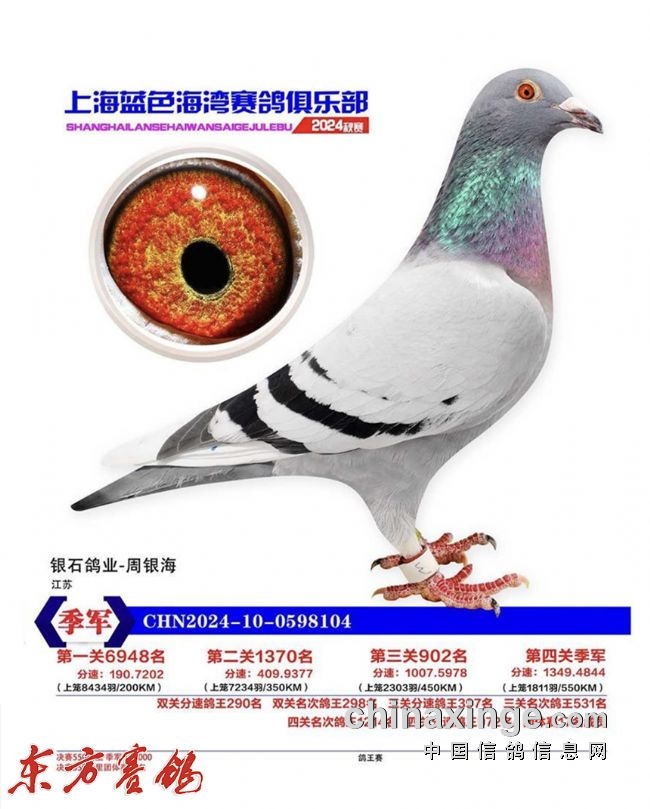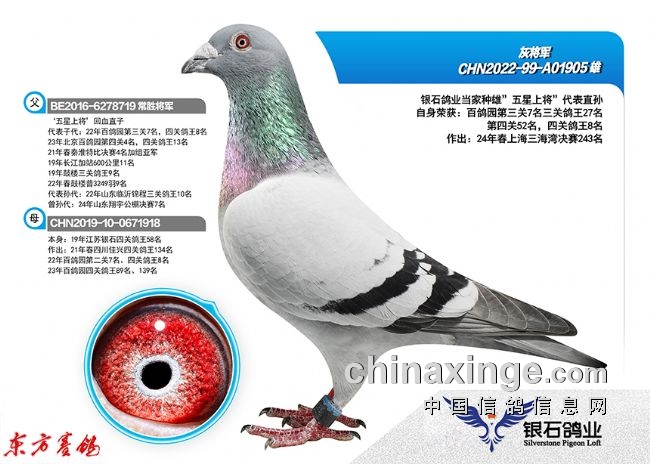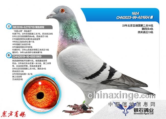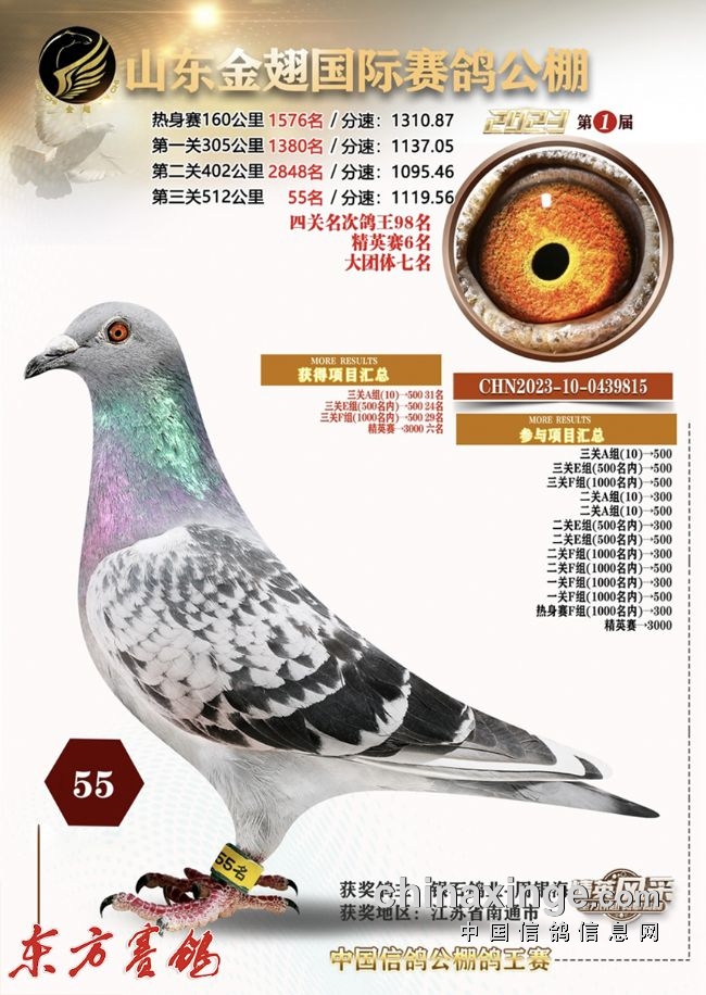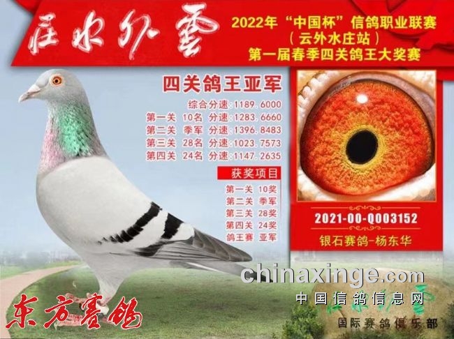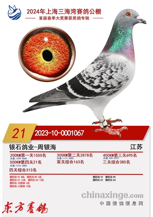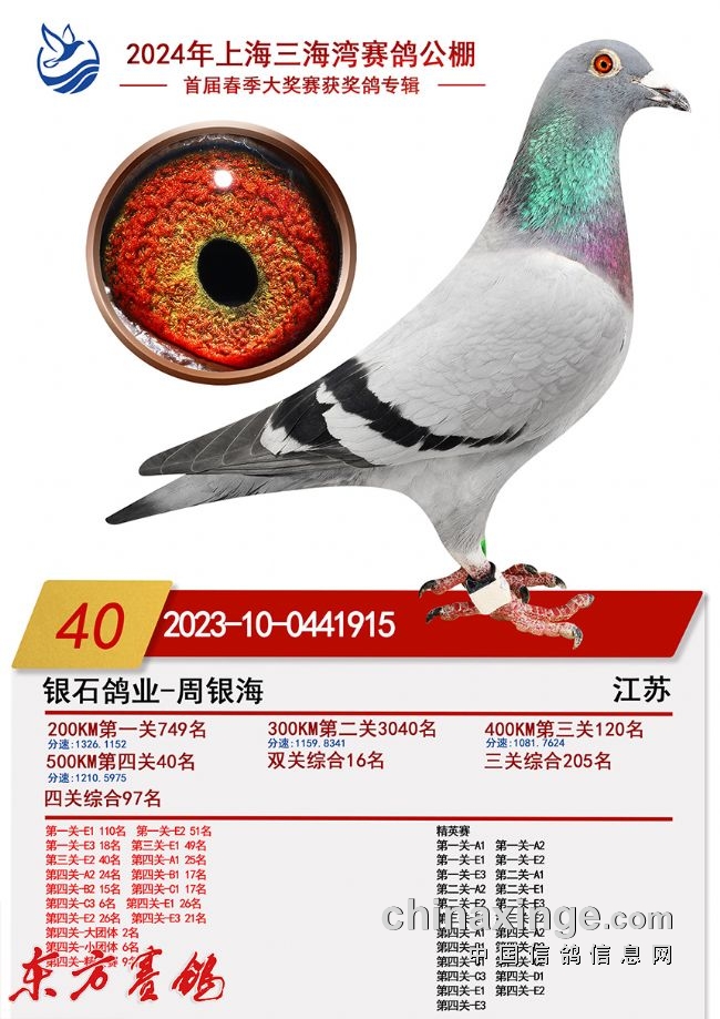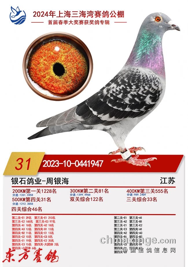 2022年春:四川嘉兴四关鸽王18名;江苏云外水庄四关鸽王亚军、23名;唐山阳光四关鸽王10名43名。秋:北京百鸽园四关鸽王8、22名;江苏金江南四关鸽王5名、11名;上海蓝色海湾秋(四关)鸽王8名、350公里冠军。