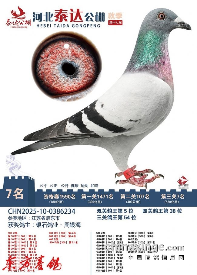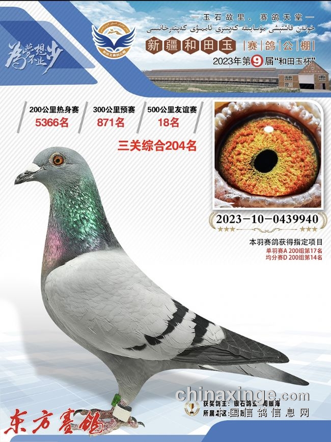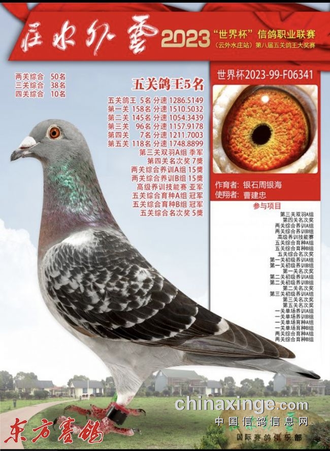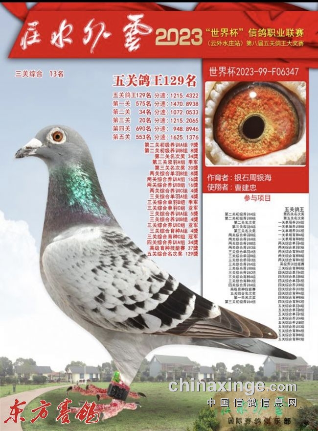 2023年:春河南众胜四关鸽王16、30名;四川嘉兴四关86、91名;唐山阳光四关鸽王37名。秋:山西神齐四关鸽王61、211、367名;北京百鸽园四关鸽王13名;开尔青年队秋棚决赛280名
