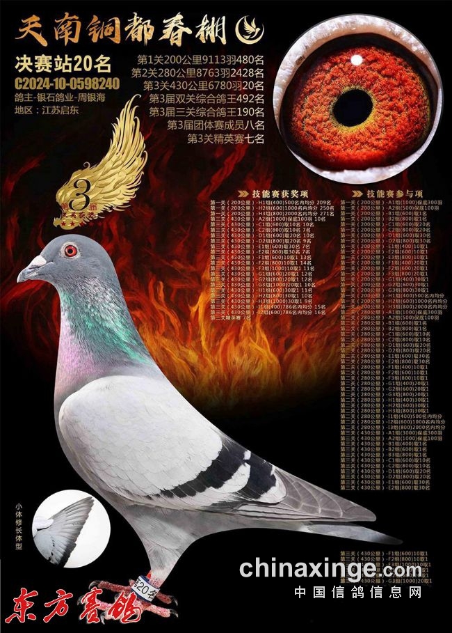 2020年春天津开创鸽王122、145名。2020年秋唐山阳光四关鸽王14、29名;辽宁大博翔五关鸽王48、87名;江苏云外寄养棚五关鸽王72、155名。