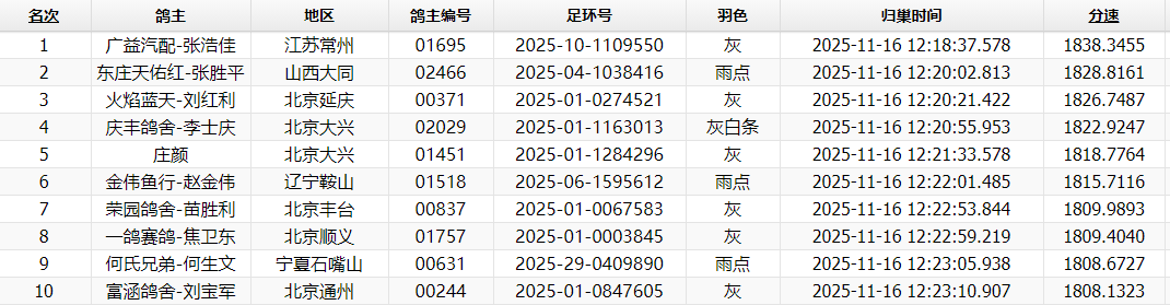 山西大同鸽友东庄天佑红-张胜平的2025-04-1038416雨点,在两分钟后也迅速打钟,飞行分速1828.8161米/分,获得亚军。