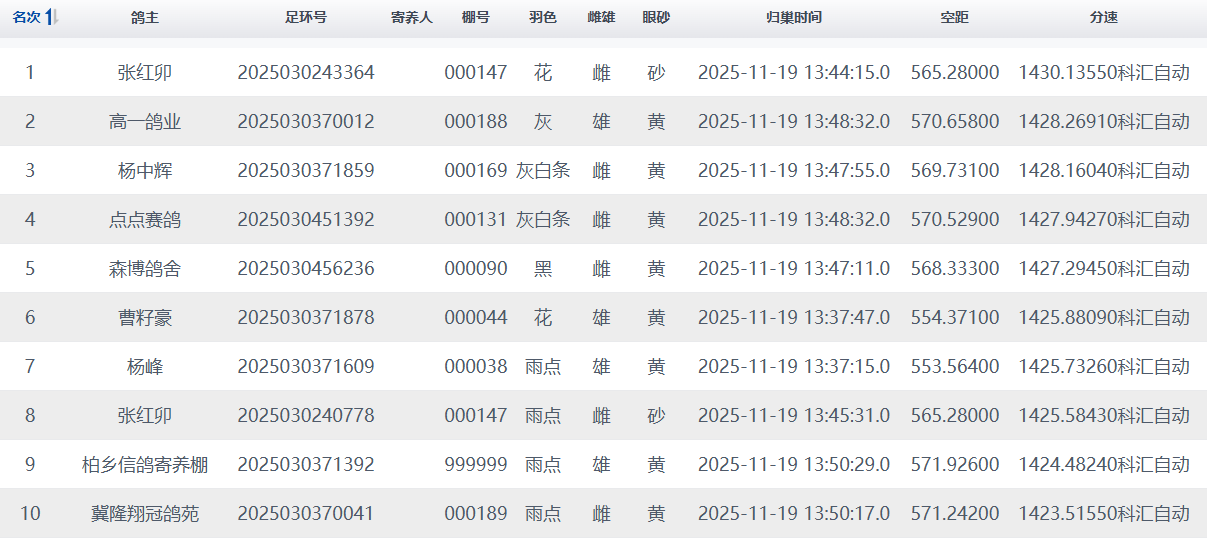 冠军于13:44:15率先报进,鸽主为张红卯,赛鸽环号2025-03-0243364,是一羽砂眼花雌,飞行空距565.280公里,平均分速达1430.1355米/分。