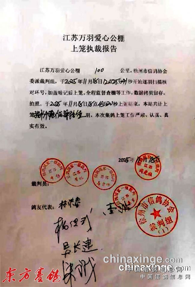 集鸽:昨日集鸽,由徐州市信鸽协会裁判组执裁,五位鸽友代表参与全程监督。集鸽从午后的12:25:41开始,经逐羽扫描、核对环号、加盖暗记章后上笼,于18:45:20井然有序地完成集鸽工作,共集鸽8675羽。