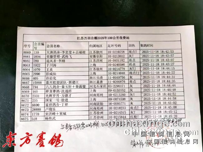 11月19日上午9点08分,江苏徐州万羽赛鸽公棚2025年第十届爱心杯秋季竞赛百公里收费站在安徽省宿州市泗县后张庄开笼,8675羽小将参与了收费站打卡。万羽小将意气风发,一小时归巢7432羽,一小时归巢率高达85.67%,奠定了今秋万羽后续四关赛的基础。