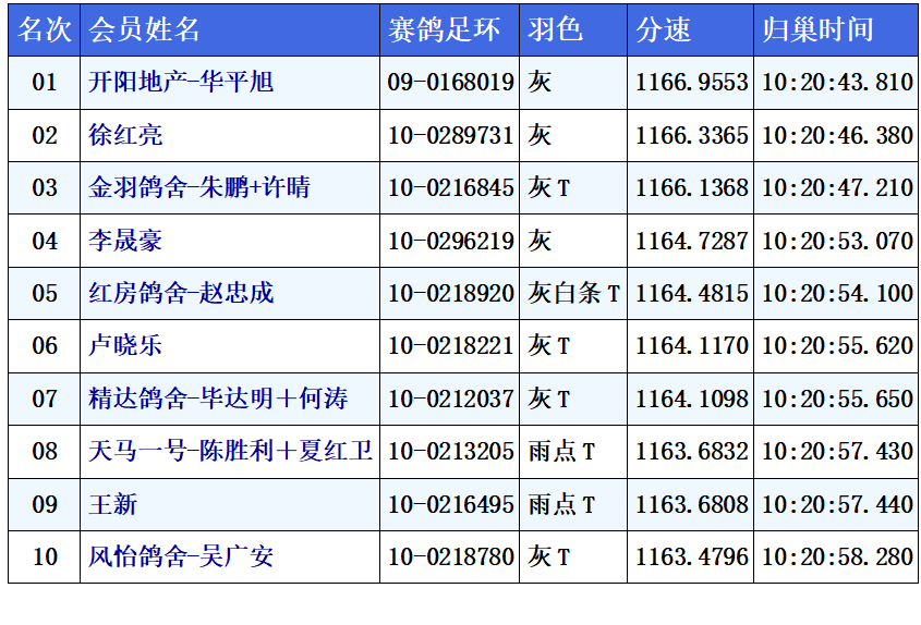 凯旋:上午10点19分,经过1小时11分钟的御风飞舞,第一梯队大几十羽浩浩荡荡凯旋,在空中盘旋炫舞,第二大梯队气势恢宏地接踵而来。空中迈步庆祝了凯旋的喜悦后,纷纷潇洒优美地落棚去报到。开阳地产-华平旭麾下09-0168019灰,于10:20:43.81捷足先登拔得头筹,分速为1166.9553米。百公里收费站排名先后没啥实际意义,只要归来就是成功,但名列前茅总是让人心情愉悦。