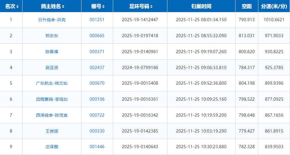 令人遗憾的是,比赛开笼当天无鸽归巢。第二日早晨8时01分,日升鸽舍-洪亮的一羽2025-19-1412447率先报进,空距790.913公里,分速1010.6621米/分,是本场比赛唯一分速破千的归巢鸽,斩获冠军!