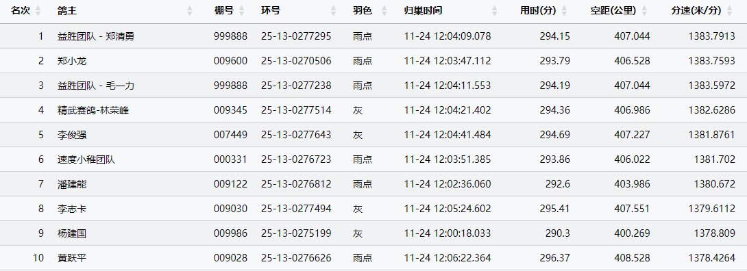 山区难飞,但训练有素的赛鸽们仍旧突破重重阻碍,大批归巢。中午12时04分,益胜团队一连归来两羽赛鸽,斩获一关冠季军。冠军鸽主为益胜团队-郑清勇,赛鸽环号25-13-0277295,分速1383.7913米/分,空距407.044公里。季军鸽主为益胜团队-毛一力,赛鸽环号25-13-0277238,分速1383.5972米/分,空距407.044公里。
