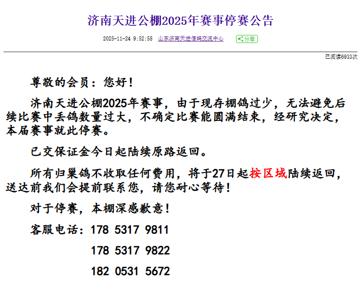 11月24日9点,山东济南天进公棚发布一则公告,宣布本届秋赛停赛。公告指出,由于现存棚鸽过少,无法避免后续比赛中丢鸽数量过大,不确定比赛能圆满结束,经研究决定,本届赛事就此停赛。