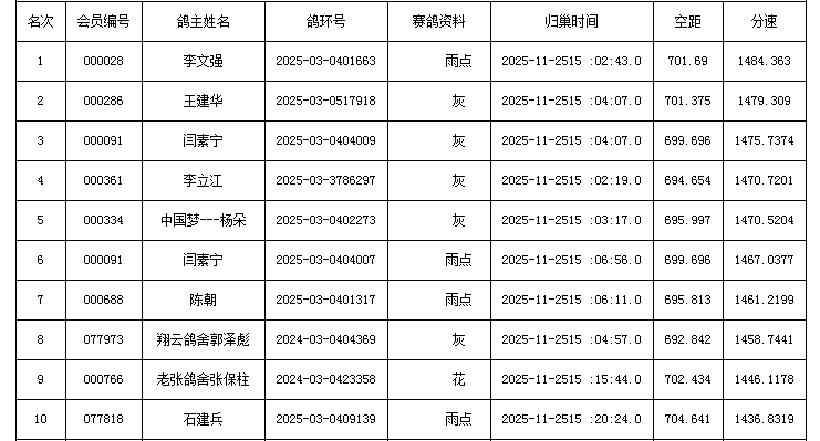 夺得冠军的是鸽友李文强的赛鸽2025030401663,这是一羽黄眼雨点雌鸽,于15:02:43率先归巢,空距701.690公里,分速高达1484.3630米/分,展现了极强的飞行能力,冠军荣誉实至名归。