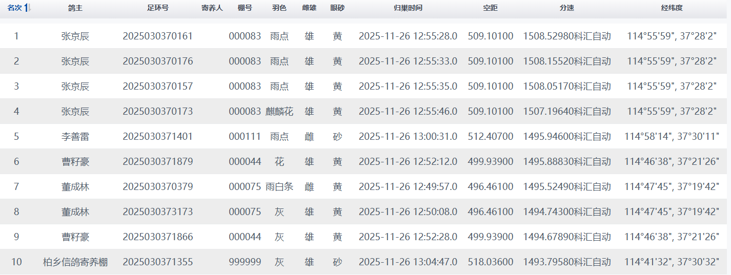12点55分,四羽小将几乎同时归巢!来自鸽友张京辰名下赛鸽强势包揽冠、亚、季、殿军,成绩惊艳全场。冠军为环号2025030370161,是一羽黄眼雨点雄鸽,飞行空距509.101公里,平均分速高达1508.5298米/分。亚军环号2025030370176,季军环号2025030370157,殿军环号 2025030370173。四羽战将齐头并进,横扫千军,祝贺张京辰鸽友揽获高位!