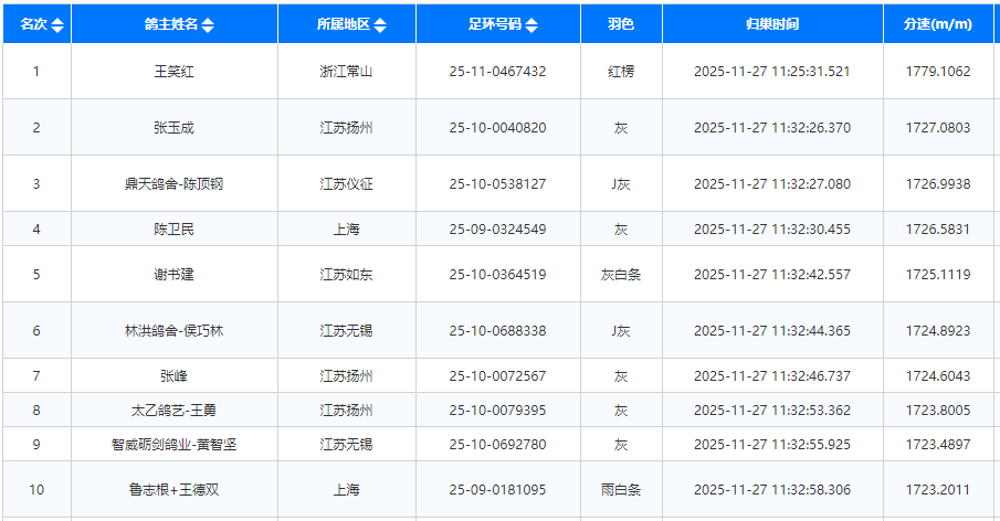 归巢消息:上午11点半左右,赛鸽们开始高速归巢。鸽友王笑红的25-11-0467432红楞,11:25:31打钟归巢,飞行分速1779.1062米/分,拿下冠军。鸽友张玉成的25-10-0040820灰,11:32:26打钟归巢,飞行分速1727.0803米/分,获得亚军。鼎天鸽舍-陈顶钢的25-10-0538127灰,飞行分速1726.9938米/分,获得季军。