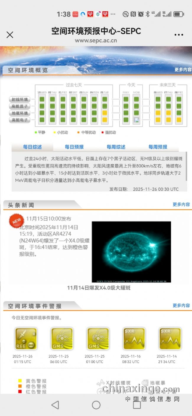 过去24小时,......受重现性冕洞高速流的持续影响,太阳风速最高上升至800km/s左右,地磁有6小时达到小磁暴水平,15小时达到活跃水平,3小时处于微扰水平。