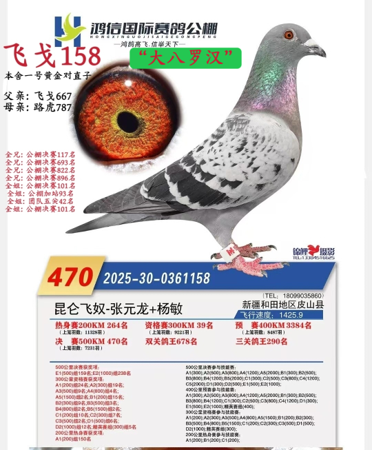 212名(飞戈909)和飞戈926,是同父异母的关系,他们的父亲是飞戈558,决赛30名。去年飞戈558配春秋572,直女:飞戈708,获得180公里187名,300公里185名,决赛520公里779名。飞戈558,两年交配3只雌鸽,子代都有所表现,说明飞戈558是一只钻石级别的种雄。
