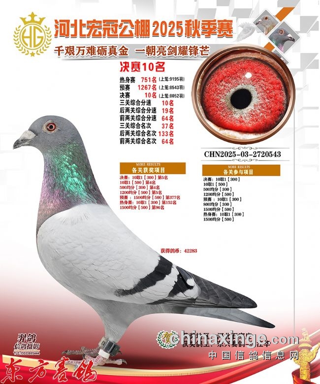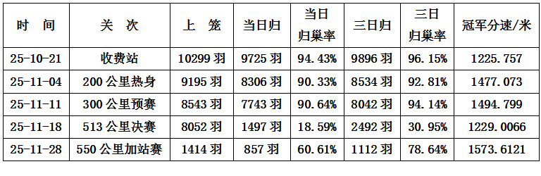 从成绩表一目了然地看到,从收费站到预赛,当日归巢率均达到90%以上,决赛空距长达513公里,比那些打480公里的棚多出33公里,毫无悬念地当日报满,550公里加站赛冠军分速达到1573.6121米,三日归巢率78.64%。