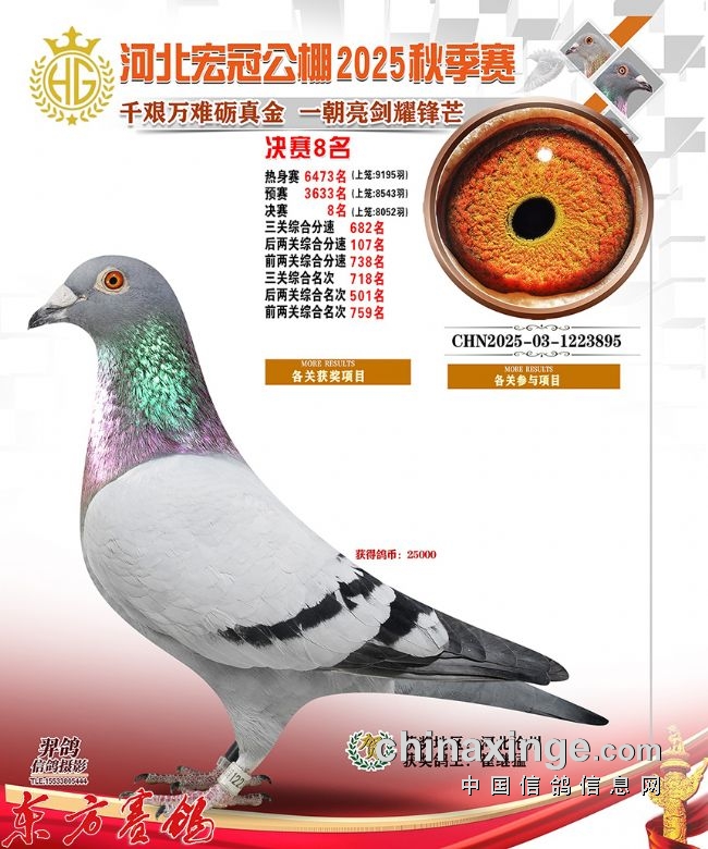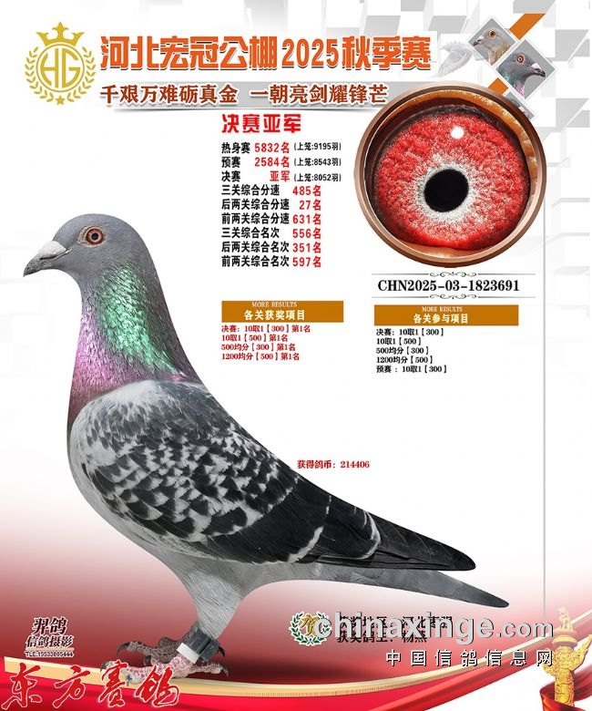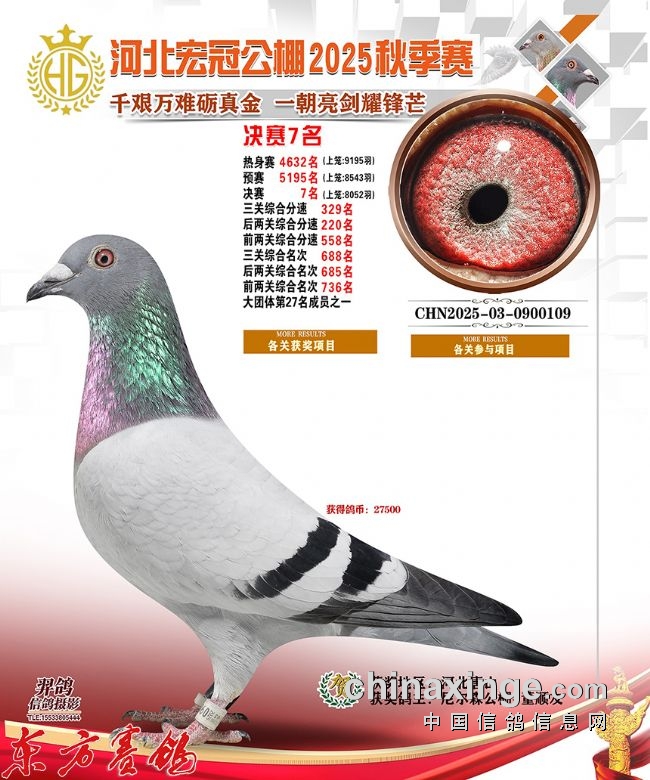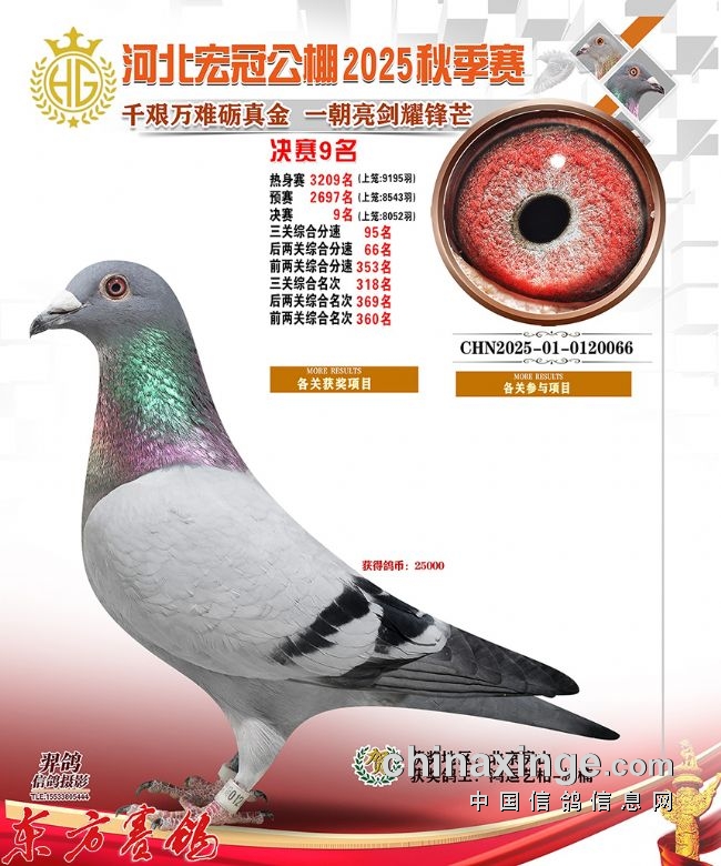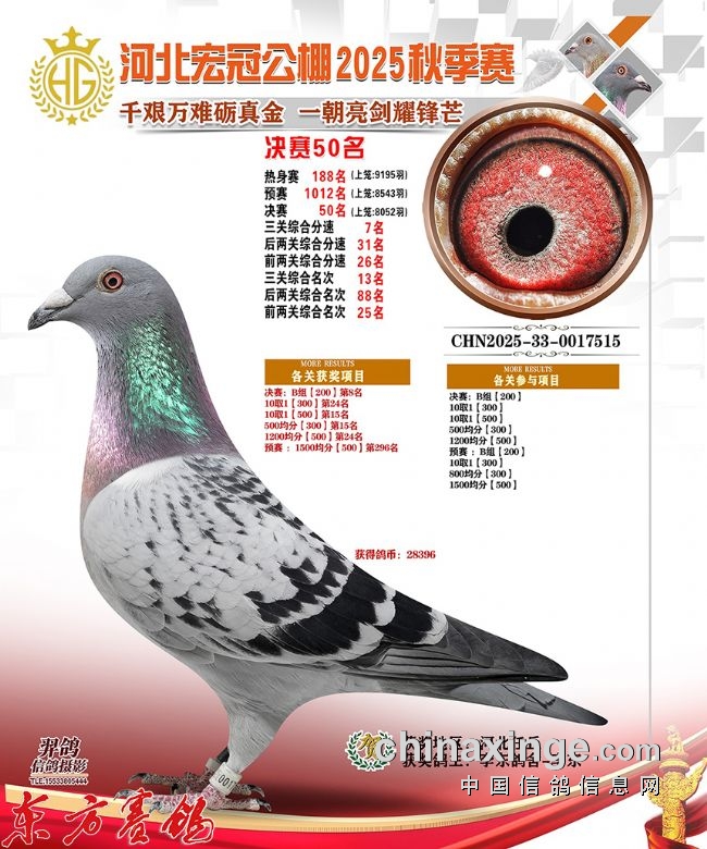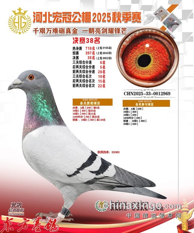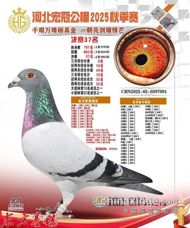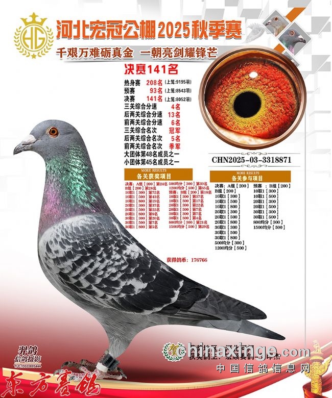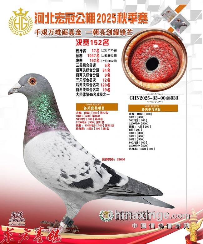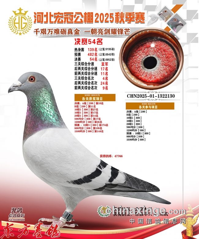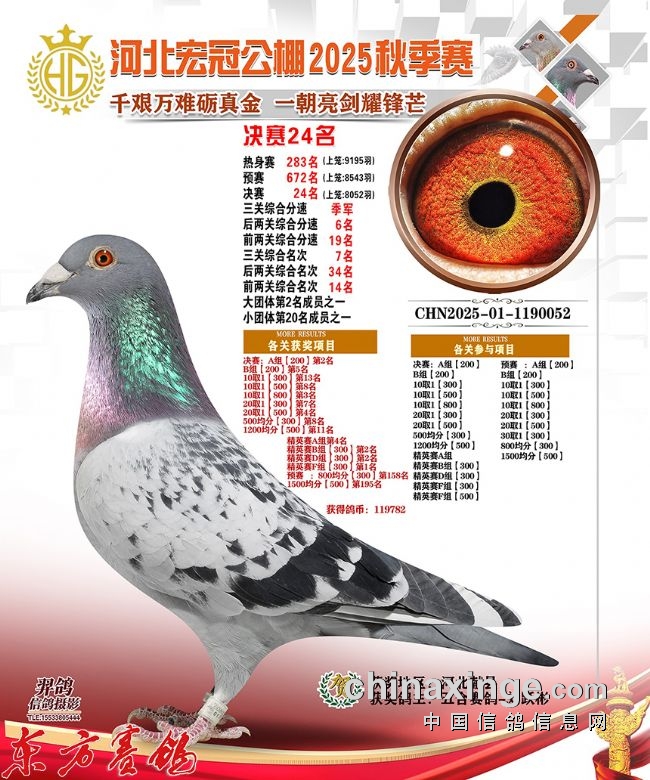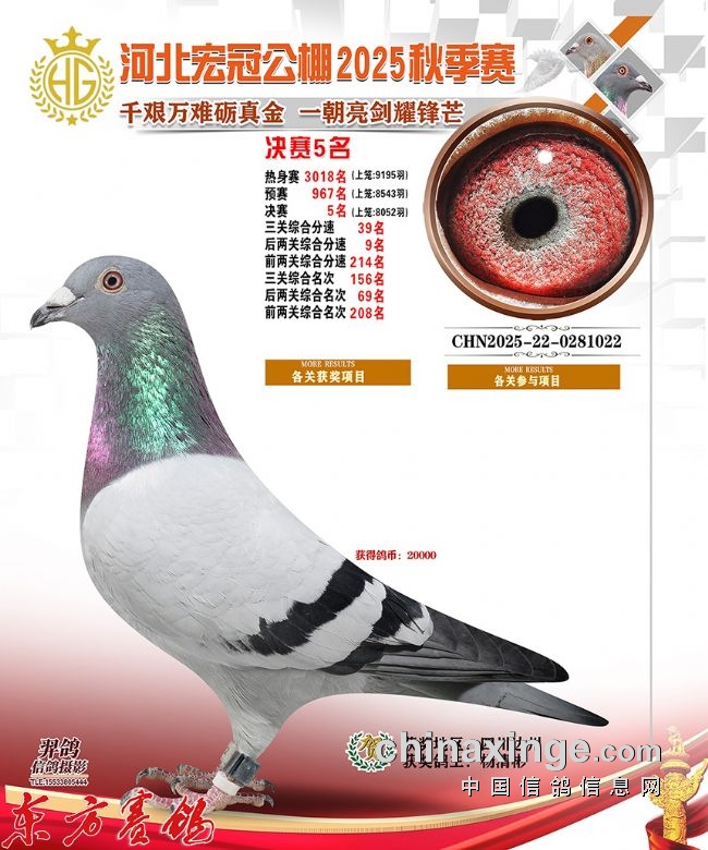 竞技赛场优胜劣汰是无情的,但笑到最后走向拍卖场的鸽子绝对是关关淘汰中优中选优,在12月4—5日期间,宏冠公棚1000羽决赛鸽及550公里加站赛62羽奖鸽,这些通过多关赛及恶劣天气淬炼,以不败之姿在14000羽入棚鸽中脱颖而出,这些走上T台为主人争得荣誉的鸽中精英绝对是鸽友们引种再战公棚的靓崽靓妹,明年它们的子代在公棚里再揭龙虎榜、傲视群雄并不是神话,好种出好苗,好树结好桃,宏冠小将昂首挺立诚迎全国赛场精英们的挑选。