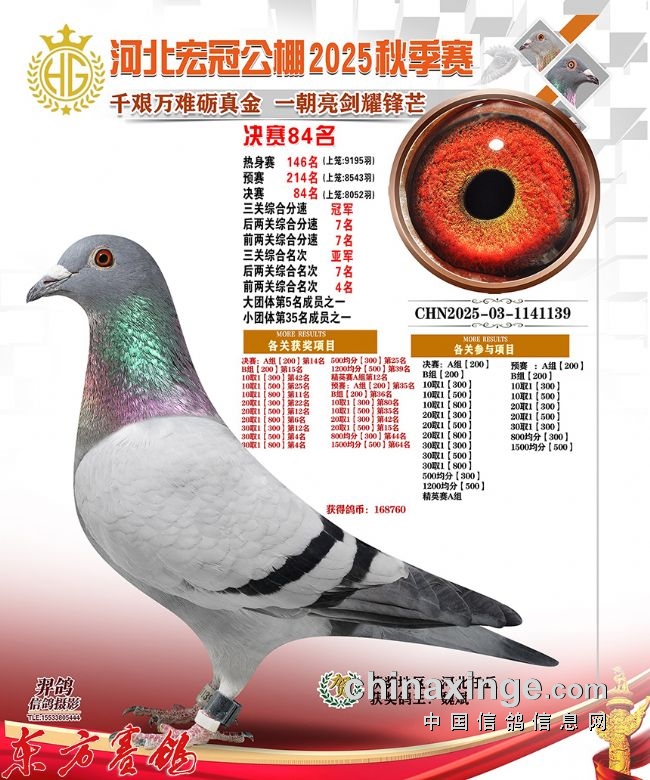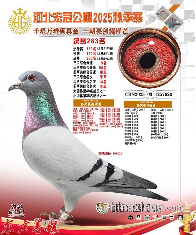 河北宏冠公棚打了一个风风光光的秋赛,从100公里收费站到550公里加站赛,五场比赛关关精彩,与华北平原同类公棚相比,绝对是公棚中的翘楚。公棚收获了口碑、收获了鸽友们的认同,同时也诠释了公棚用精湛的养功、周到、严格、公正、透明赛事安排擦亮了年度赛事成色。