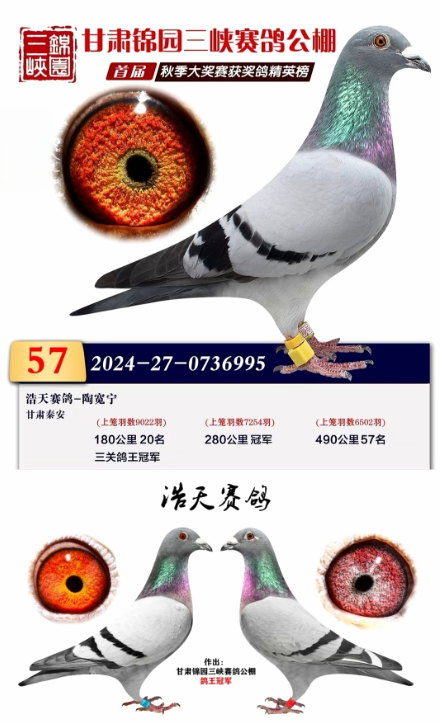 这已是浩天赛鸽在该公棚取得的第二次高位成绩。去年,鸽主孟亮凭借一羽环号为2024-27-0736995的灰鸽,勇夺三峡公棚三关鸽王冠军——首关第20名、二关冠军、三关第57名,关关表现优异。这羽“神鸟”出自桑杰士与凡登布克的配对,血统纯正、赛绩突出。而今年获得殿军的这羽赛鸽,母亲为去年鸽王冠军半平辈,父亲则是闪电配奶酪,血脉延续十分强劲。