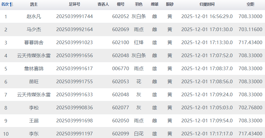 亚军是马少杰的2025039992164黄眼雨点雌,12月1日17:01:30打钟,飞行空距703.116公里,分速1247.74680米/分。