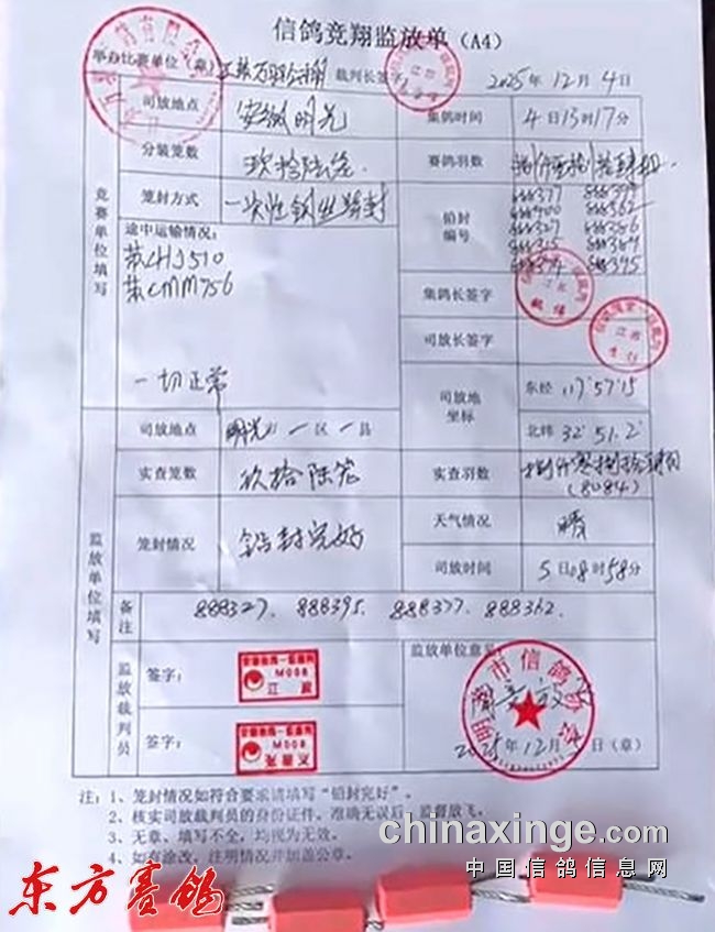 集鸽:昨日集鸽由徐州市信鸽协会裁判组执裁。集鸽从13:17:32开始,三个工作团队同时开展工作,至19:05:30结束,过程有条不紊,共集鸽8084羽。鸽友代表对集鸽扫描、装笼、放飞直至司放进行全程参与监督。