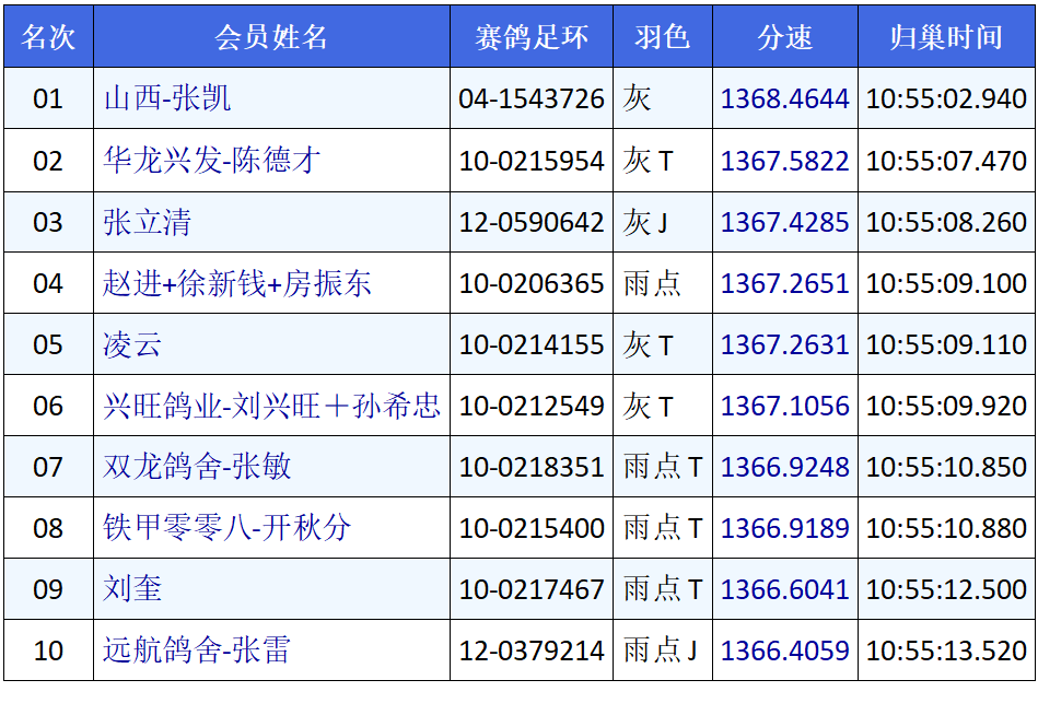 山西大同张凯鸽友麾下04-1543726灰,于10:55:02.94通过凯旋门摘得状元,分速为1368.4644米。