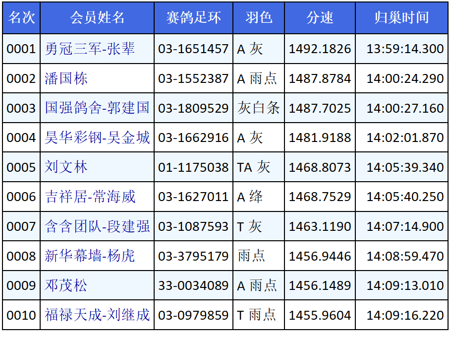 河北肃宁勇冠三军-张辈麾下战神03-1651457灰,于13:59:14.30通过凯旋门摘取桂冠,实现了勇冠三军的梦想。冠军鸽分速为1492.1826米/分。河北景县潘国栋和国强鸽舍-郭建国麾下战将分获亚军、季军。