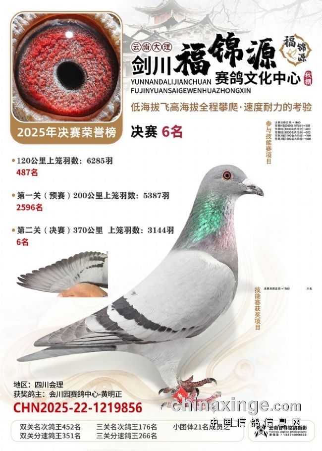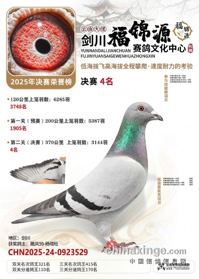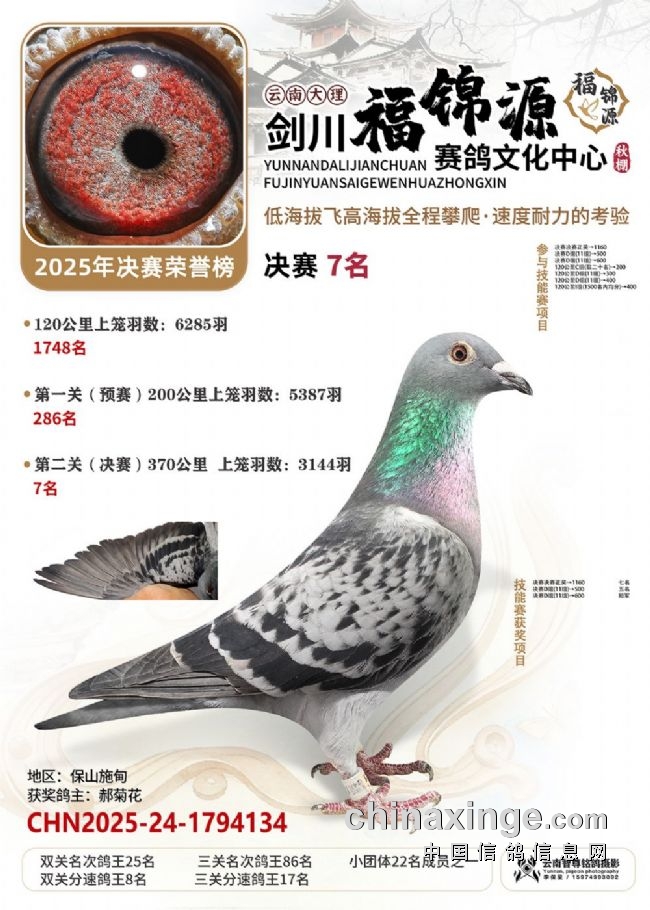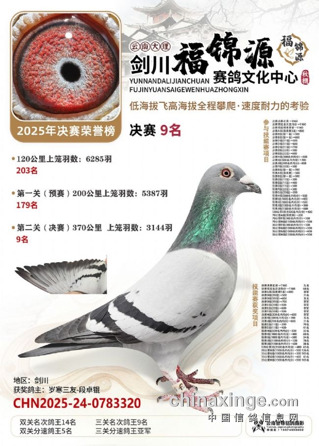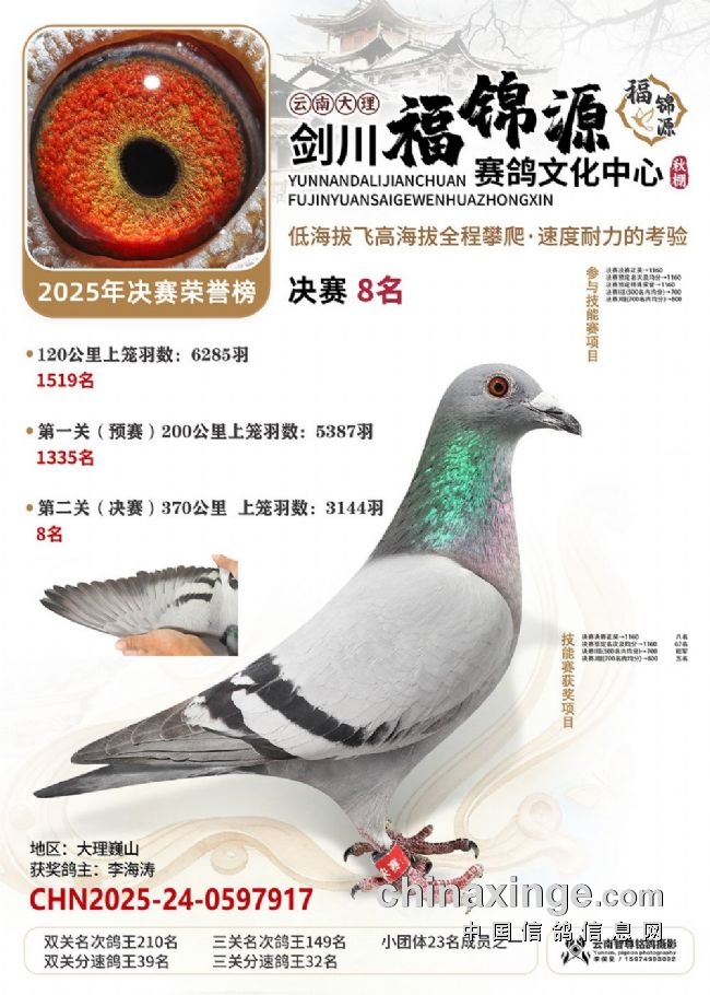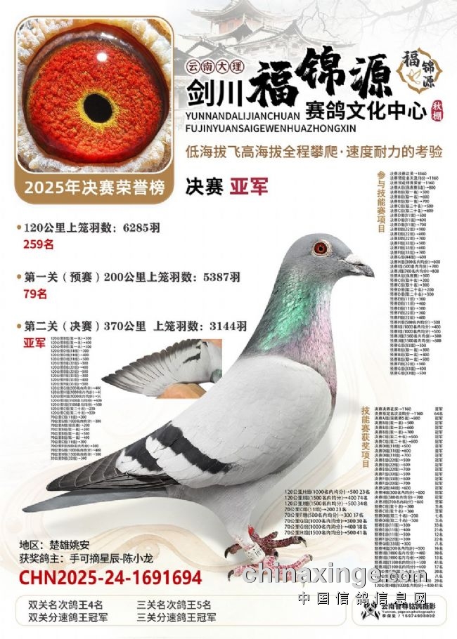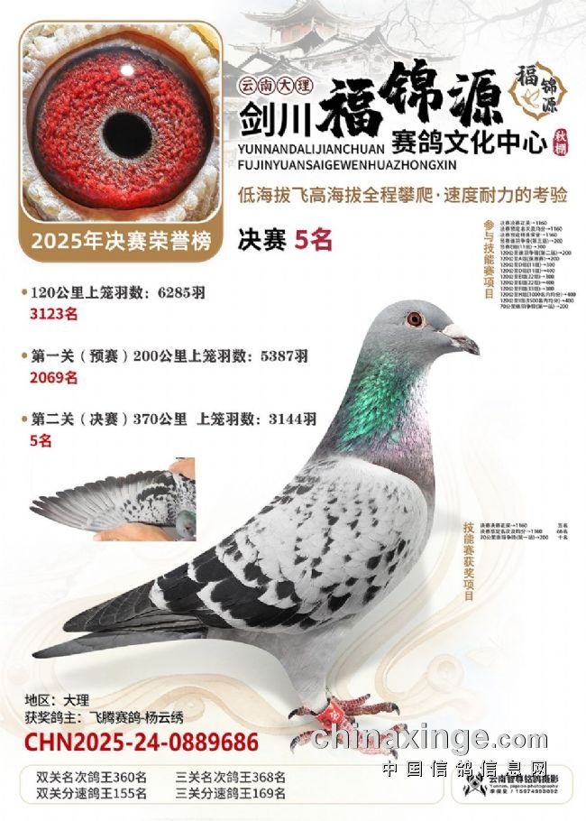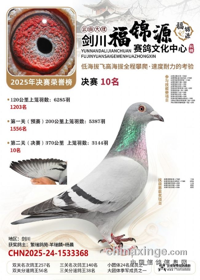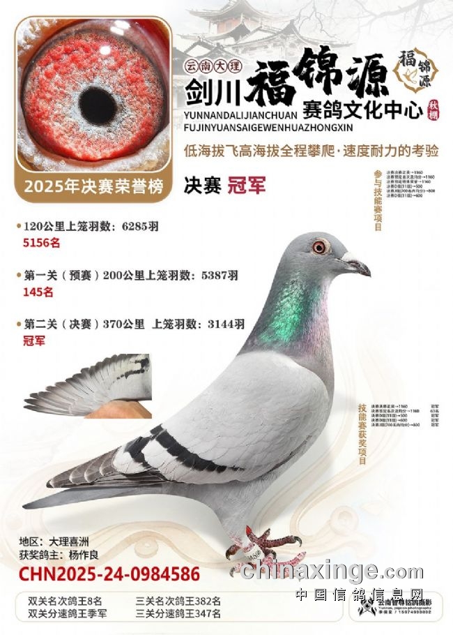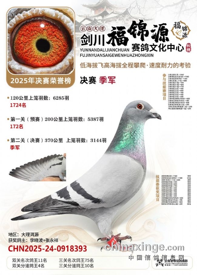 大理剑川福锦源赛鸽公棚的2025年第六届秋赛,走的是一条“猛将练精兵”的扎实路子。多年办赛的经验,让公棚已经熟练掌握饲养中的各方细节,稳稳接过鸽友手里的一万羽赛鸽,每一羽都是能翻山的耐力悍将!“猛”在哪?训练猛:20公里查棚之后,公棚多次加训,从35公里到70公里、120公里,再加上两场正赛,小将们足足飞了800多公里,为决赛挑战高海拔飞行做足了准备。双关筛选真正的精英:决赛中,大理喜洲鸽友杨作良的2025-24-0984586灰鸽,以1260.0808米/分的分速获得冠军。曲靖鸽友桂建中的2025-24-1300804,双关成绩分别为5名、28名,十分拔尖,获得双关鸽王冠军!