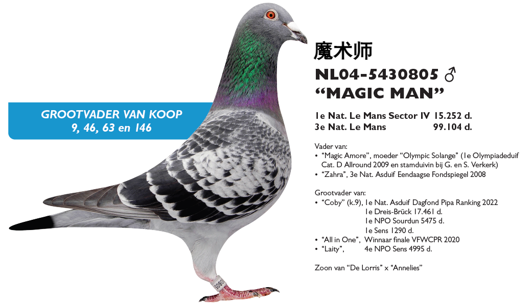 值得一提的是“魔术师”——曾获勒芒99104羽总季军。但全欧洲鸽友都知道,这羽季军含金量远超冠亚,它的空距比冠亚军多出近200公里。“魔术师”育出 “魔幻爱神”,亦为荷兰佛科克父子带来里程碑式的成功;