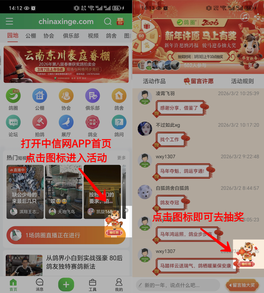 方法一:点击APP进入鸽圈,点击鸽圈活动列表,选择“新年许愿 马上有奖”活动,进入活动页面,发帖或进行心愿留言,即可获取抽奖机会。