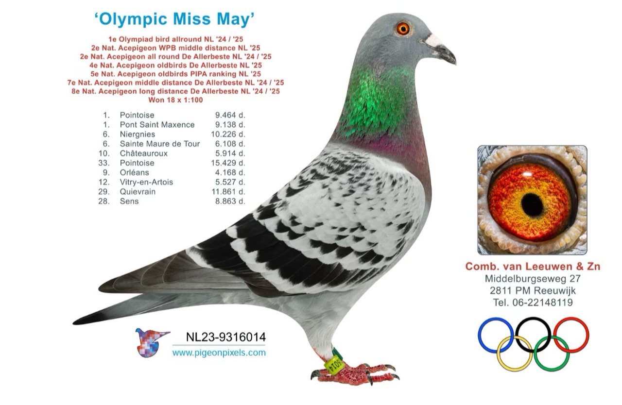 而在大洋彼岸,“油漆工”本舍的王牌——“玛丽小姐”,更是在2025年荣膺奥林匹克全能距离鸽王冠军。这一头衔的含金量远超NPO或KBDB鸽王奖,因其每两年才评选一次,且要求赛鸽在100至800公里的广阔赛程中均保持高位。