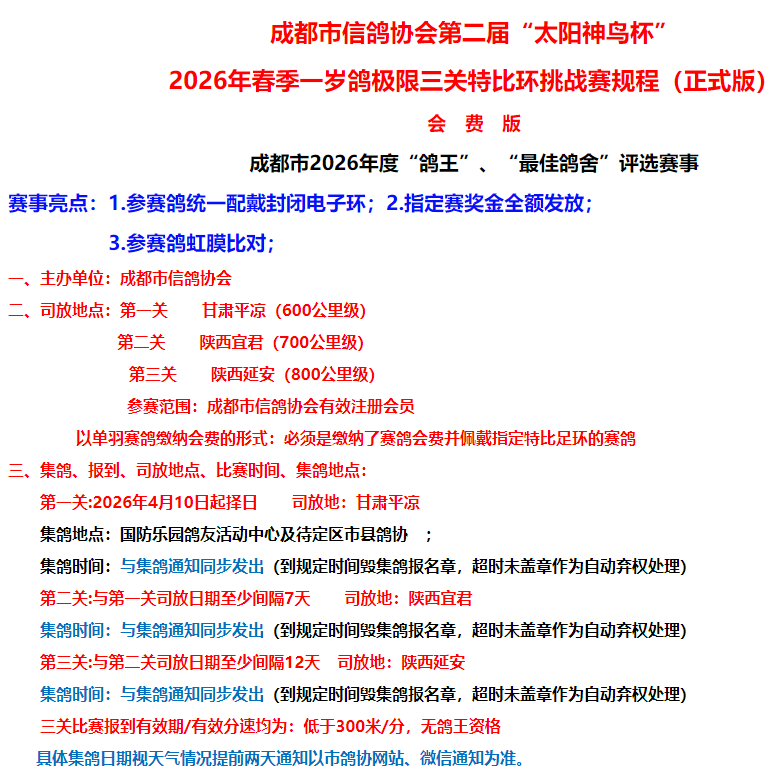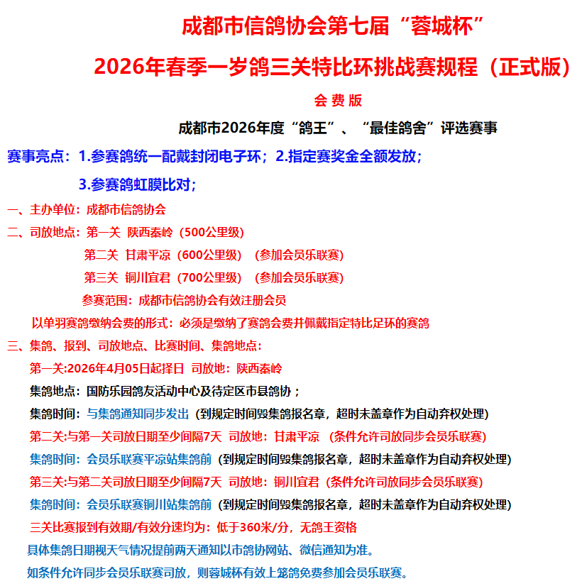 2026年春成都市第三届五赛区三关特比环大赛已经验鸽完毕,共有3055羽赛鸽参赛。 本场比赛共设有三关,分别是500公里级-司放陕西秦岭,600公里级-司放甘肃平凉,700公里级-司放陕西铜川。同时,在双关基础上增设双关赛,后两场与会员乐联赛同步。 首场500公里级秦岭站,定于4月5日后择日司放。此后空距叠加,最远打到800公里。这个春天,蓉城杯、太阳神鸟杯、五区三关特比环,以及二赛区三关特比环等多项赛事,令人期待!