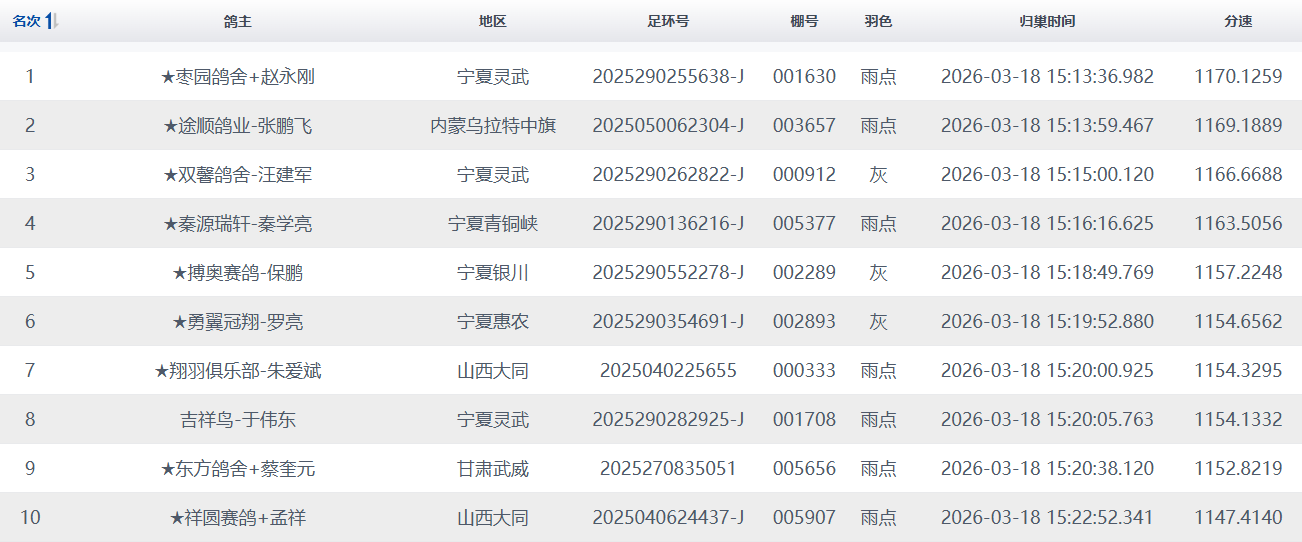 下午15点13分,两羽小将率先归来。★枣园鸽舍+赵永刚名下2025290255638雨点报进,以170.1259米/分的速度拿下冠军。★途顺鸽业-张鹏飞的2025050062304雨点夺得亚军,平均分速1169.1889米/分。随后,★双馨鸽舍-汪建军的2025290262822灰鸽获得季军,平均分速1166.6688米/分。