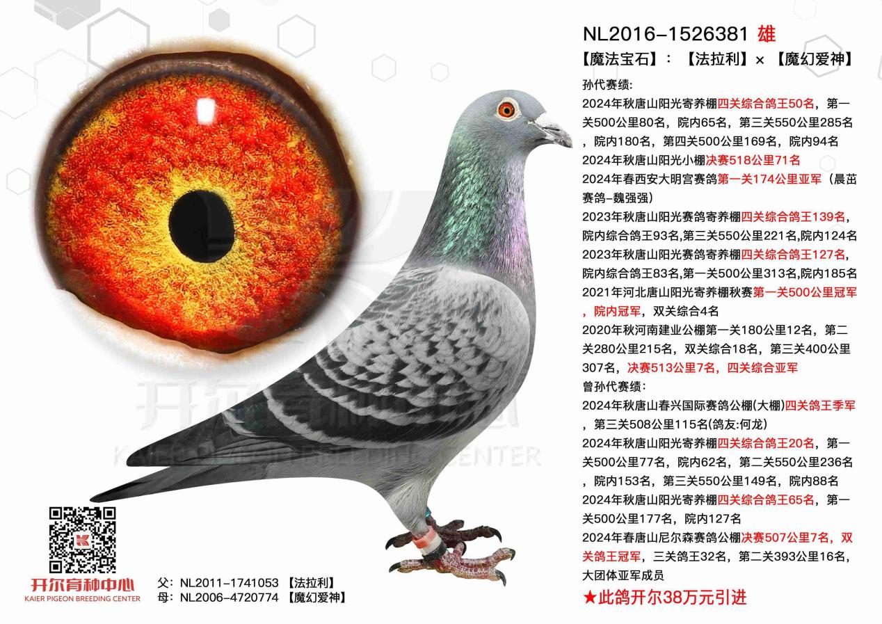 父亲出自魔法家族经典配对魔法宝石与金奖玉女,魔法家族战功赫赫,继23年开尔双关鸽王冠军、开尔双关鸽王季军、24年开尔双关鸽王季军,开创双关鸽王季军后,再获25年秋赛阳光大棚双关鸽王冠军、决赛季军。母亲为盖比闪电号的双重近亲回血,由活力闪电直子与闪电女神作育,早在24年开尔便已斩获天立双关鸽王季军,如今期待这羽魔法后裔亦能再夺鸽王荣耀。